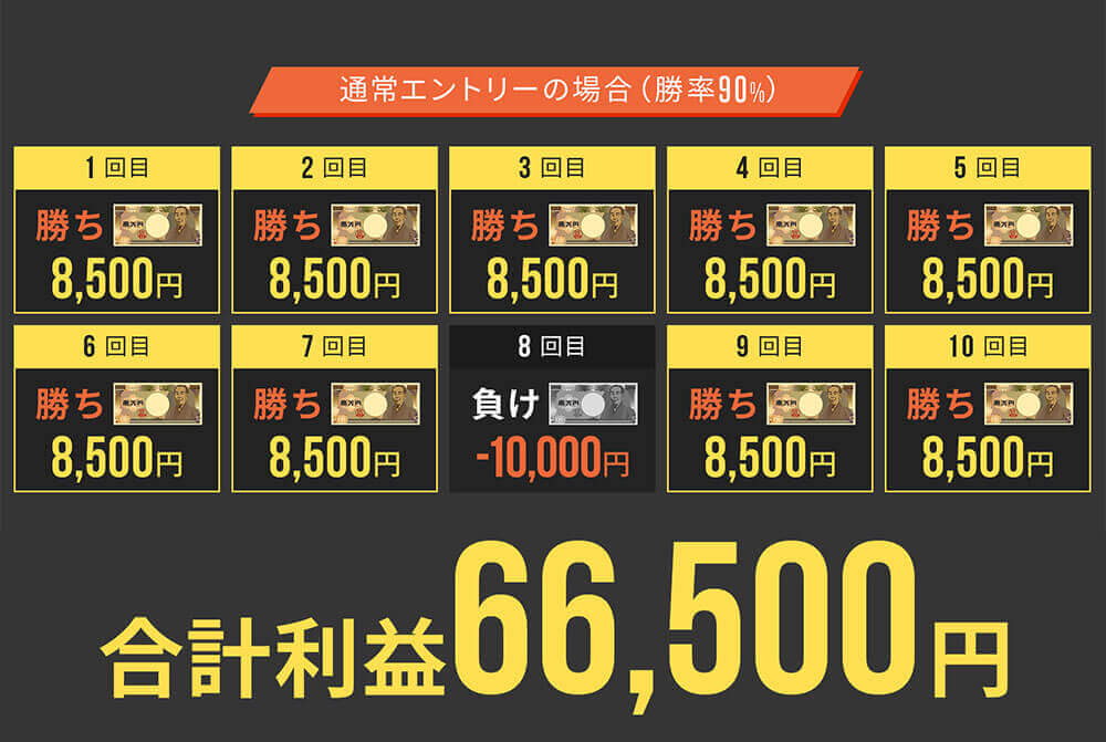 単純な勝率90%だと10回で66,500円の利益です。